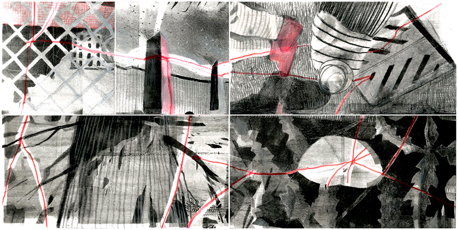 - two-sided paper zine storying a series of moments from the play/ground(ing) research project, when the elements of the playground space were connected by yarn stretched across fences, tree branches, rocks, plants, stormwater drain, bodies; unfolded, the page is intersected by a long cut