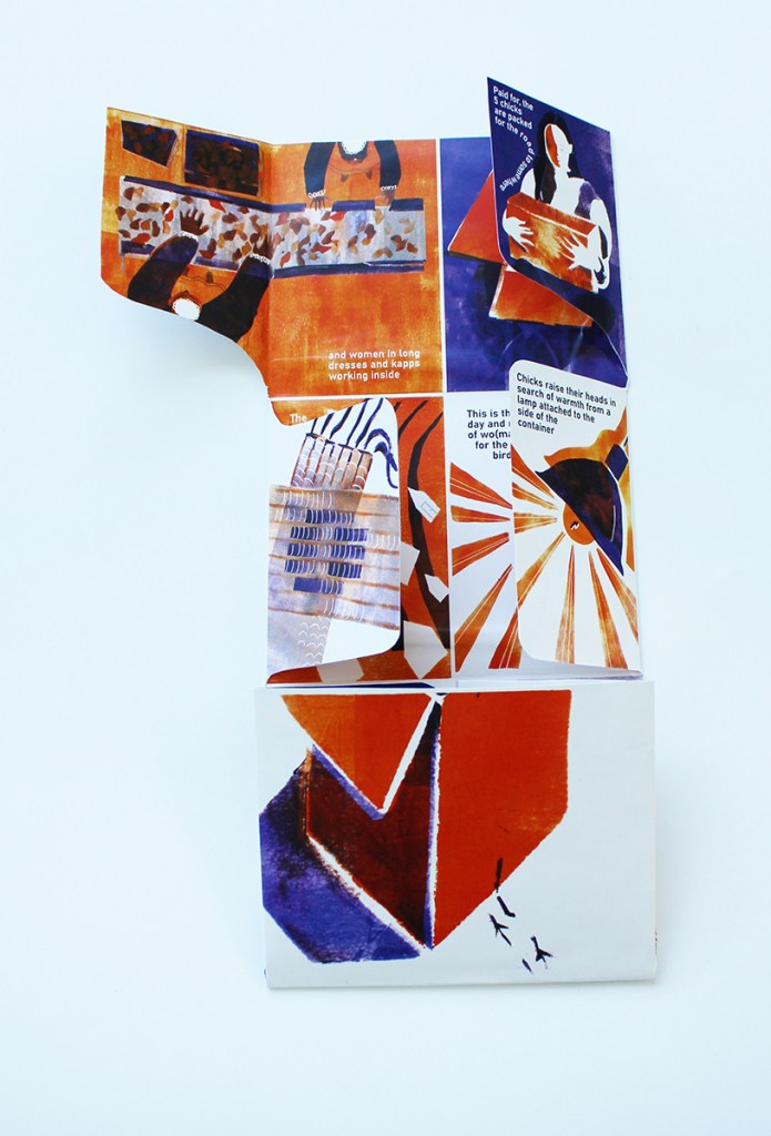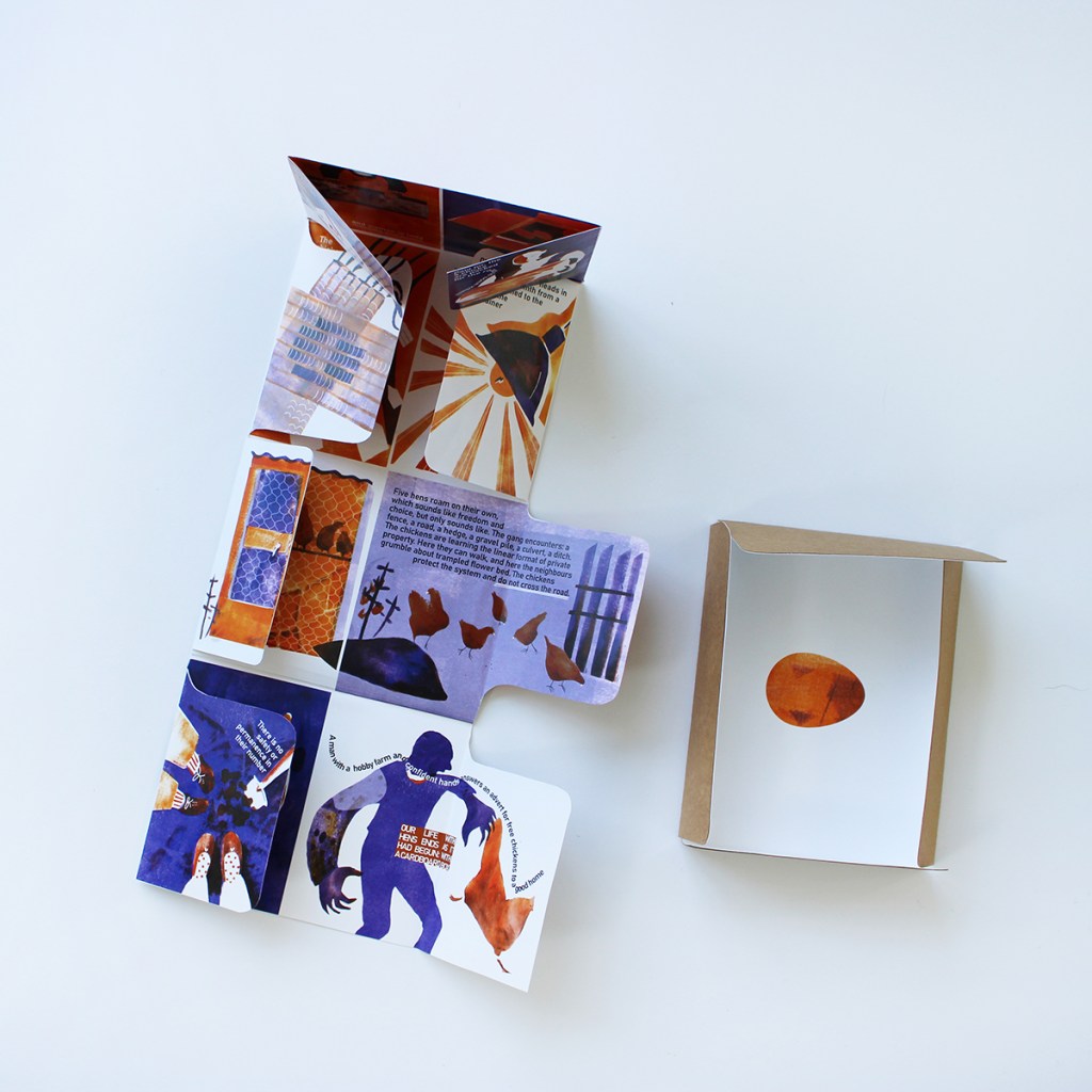 Inspired by Derrida’s contemplations on the making of Self in relation to Other, this zine is a multimodal mediation on the spatial relationship between myself and five red hens who have come to live with our family in at the start of the COVID-19 pandemic. At the time, many across North America and Europe had rushed to embrace various homestead-inspired pursuits, including purchasing chicks at the start of lockdown measures, either to seek food security or animal companionship. Having been one of the many, my wish for this zine was to acknowledge and complexify our relationship with the five backyard hens, focusing on the deeply ethical entanglements that stretch through the feathered roaming bodies of layers and the brown shells of their fragile eggs, to people, animals and politics at a father distance.