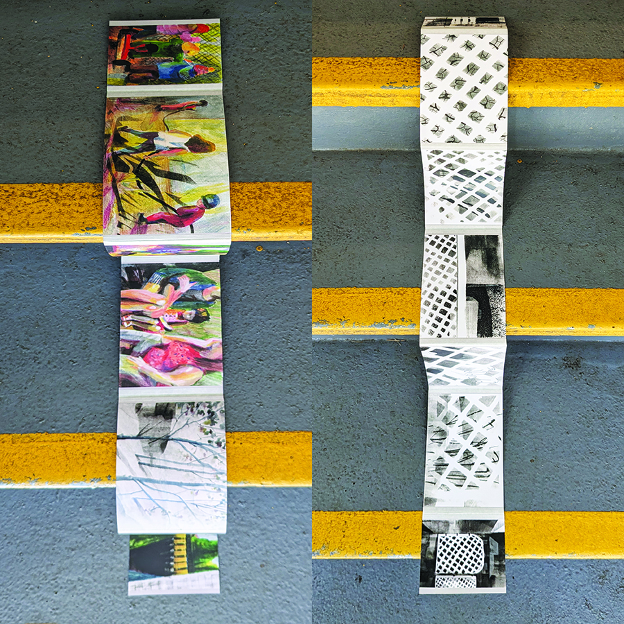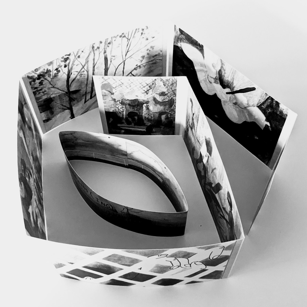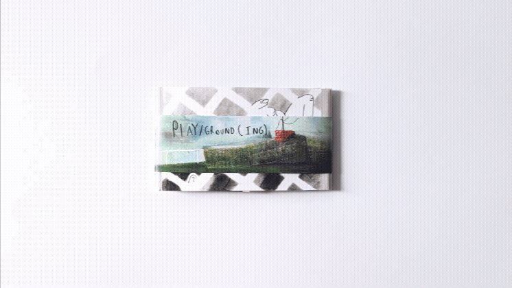 In performing the zine-making, zine-folding, zine-fingering through the the more-than-representational, the fence is thought as more than a backdrop or a tool of delineating the familiar boundaries. Its geometrical re/configurations, along with a movable bellyband which features a drawing of the playground berm, speak to how the normative, familiar and habitual (playground fences) can be attended to through its generative rhythms.