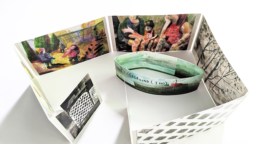 Unfolded, the zine encompasses the sections of the fence that wraps the entire playground. However, what I am concerned here are neither the qualities of the playground fence that may or may not support play or interactions (Pitsikali & Parnell, 2020) nor the fences as the technology of othering of children (Power & Somerville, 2015). Rather, in considering fences as part of “a system of transaction and a system of mobility” (Instone, 1999, p. 377), the zine attends to how the dynamism of folding/unfolding/folding-differently plays with the shifting territoriality of the space. The intention is to emphasize the fence as an active participant in the creation of the ecological milieu of the space, in the creating, interrupting, and re-configuring of the playground networks, and, thinking with Instone’s (1999) proposition of queering fences, a feature implicated in the creation of both divisions and connections.