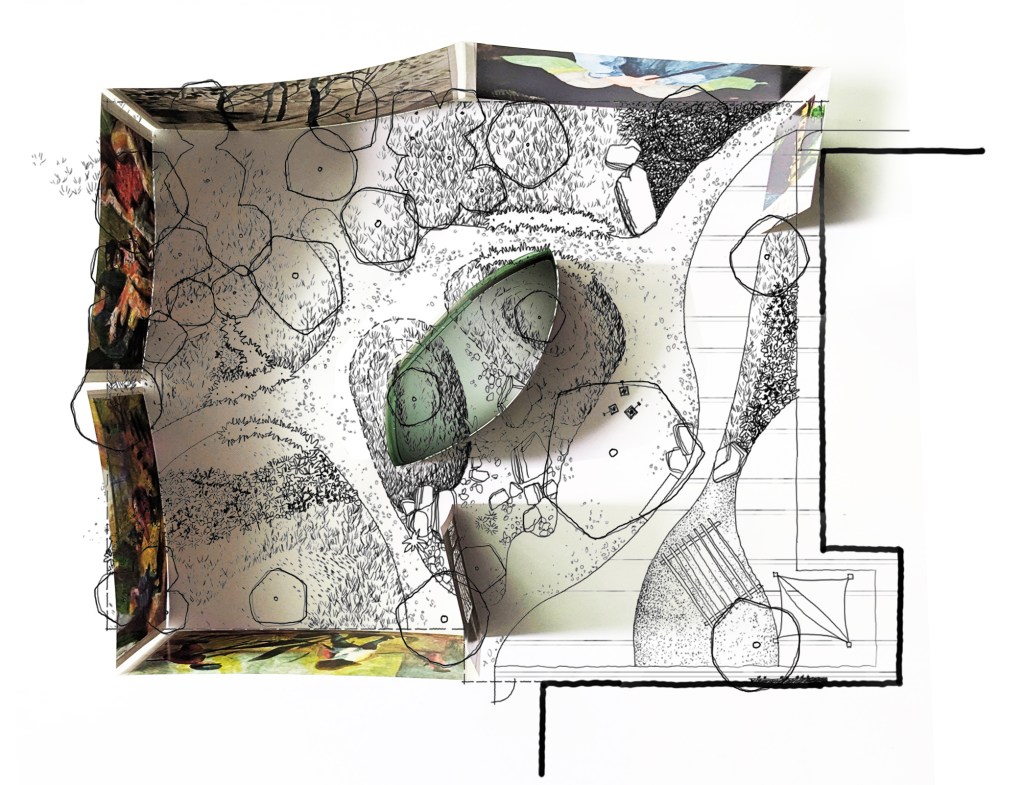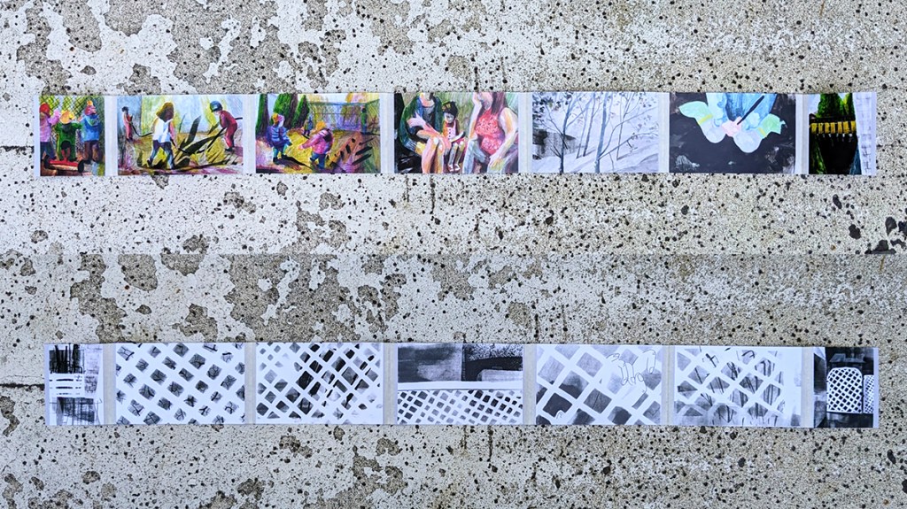 I compose a zine made out of seven panels and a bellyband (a paper circle that wraps around the entire zine, when folded). Each panels represents a particular section of the playground fence and the life unfolding “on the other side”. The two stories are not in opposition to each other, but in a conversation. The two end pieces depict playground gates and speak to the multi-scalled connections of the centre to the larger context – whether that’s the extractivist logics of the petrol-chemical complex which employed many of the centre’s families, or the immediate neighborhood and the borrowed landscape of private backyards and street trees. The drawings mix different perspectives, shifting the views from above to eye-level to intense macro-zoom. The two sides are created with different materials and techniques. The “outside” panel is rendered in black-ink stenciling and black liner, while “inside” panel includes gouach and watercolour pencils drawings. The juxtaposition is offered in direct response to the commonly-held belief that the conventional cookie-cutter playgrounds offer little to children’s worlds (Globe, 2024; Mental Floss, 2015; Guardian, 2019), a position disputed by geographers Horton and Kraft (2018a, 2018 b) who showed deeply complex and divergent socio-political lives of children multiplied by the “the localised differentiation of play” (2018b, p. 225).