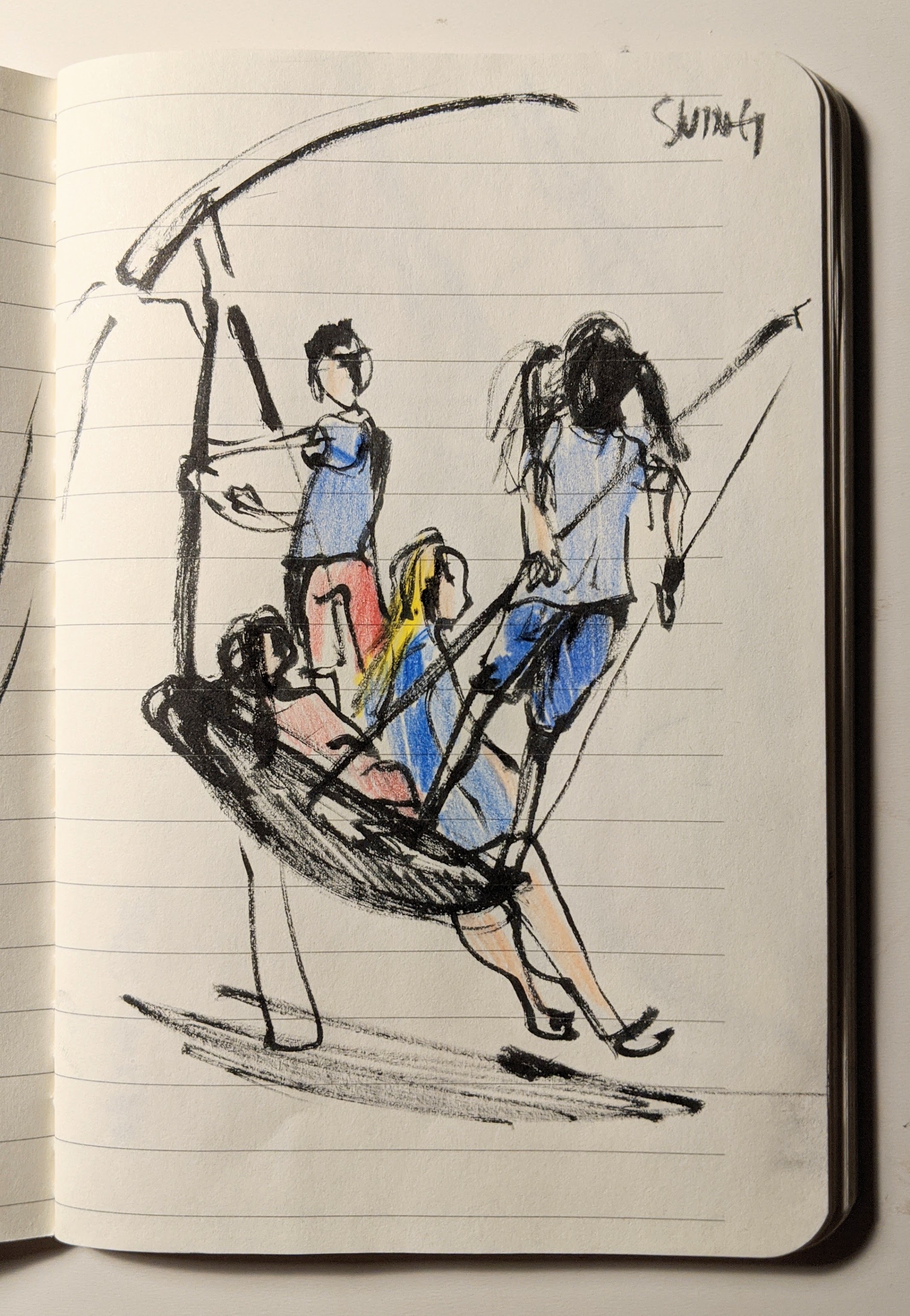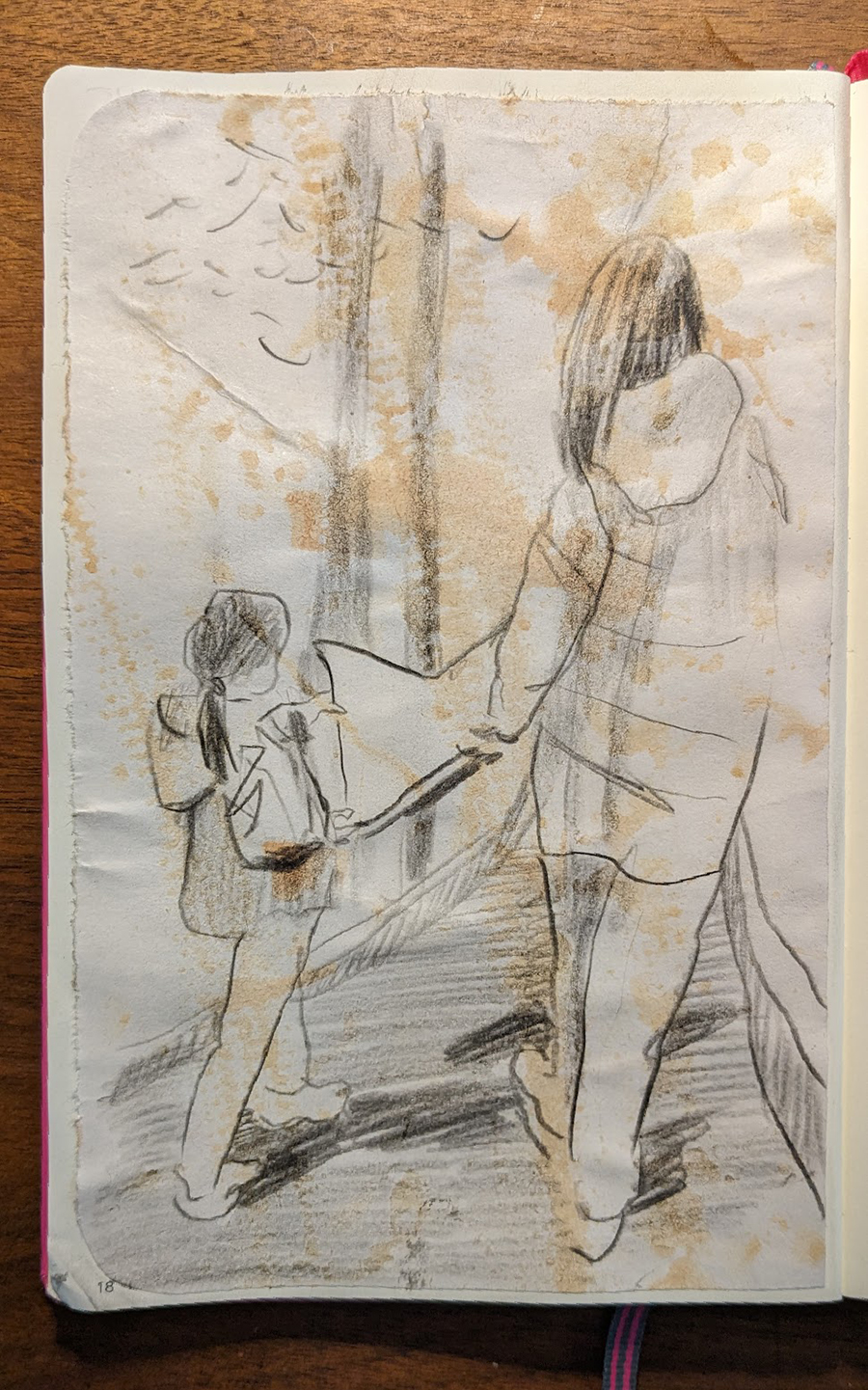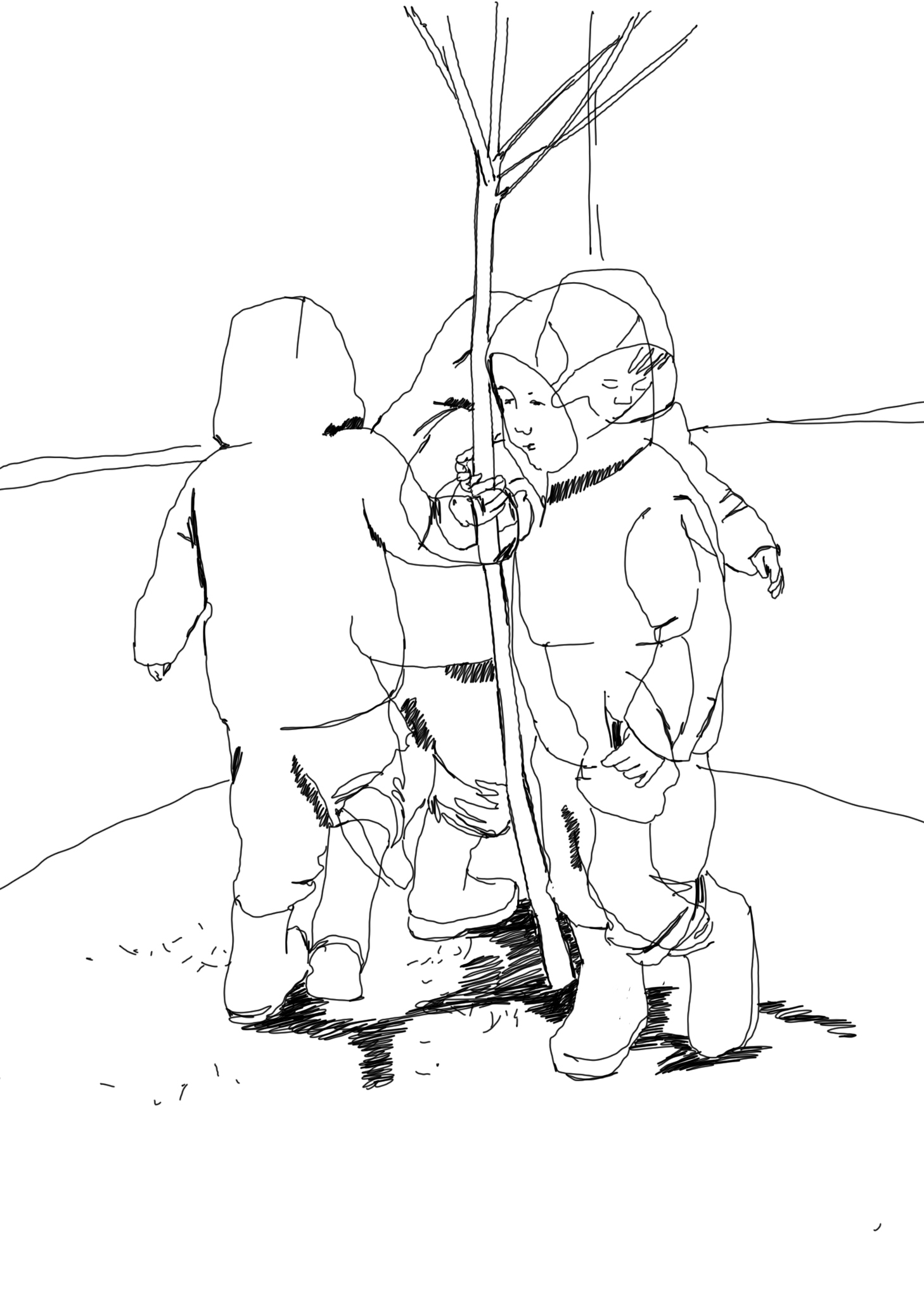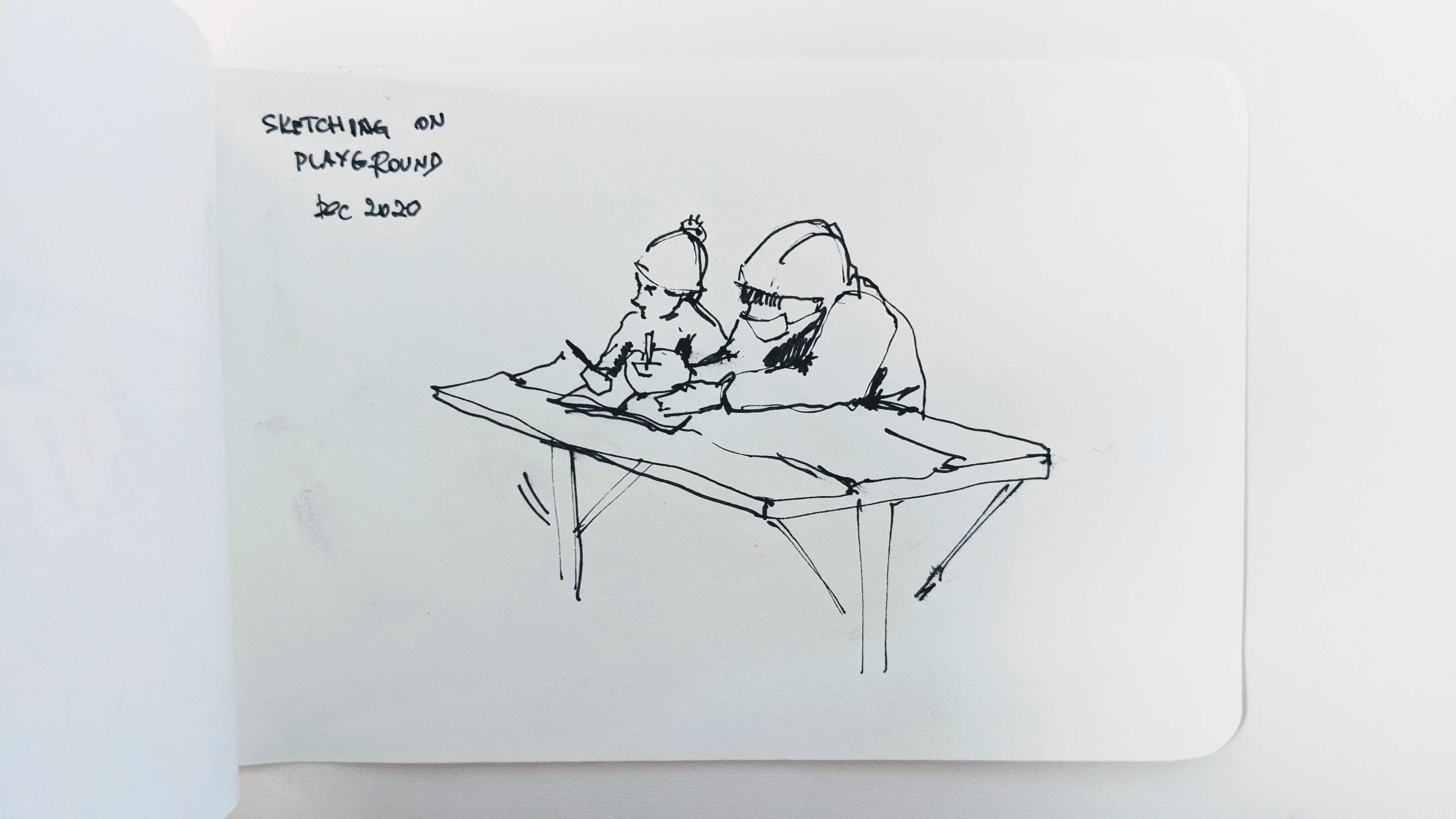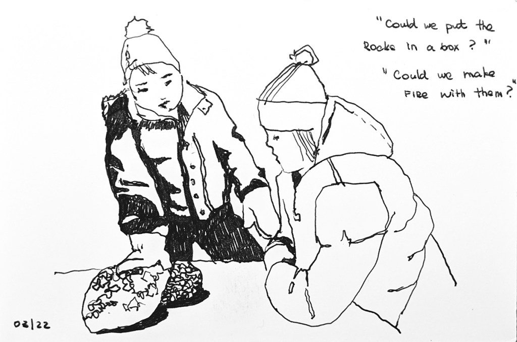 Sketching as a method of pedagogical documentation is not offered as means of revealing the subconscious (art analysis) , nor as a problem-solving tool (diagrams, charts and flows) or a technically-sound replication of forms and contours (realistic drawing). It’s not even offered as a communication tool, the way sketching is commonly used in the field of design. Instead, the invitation to sketch is fueled by the same desires as the invitation to document: to notice, consider and narrate that which is (pedagogically) significant within curriculum-making (CECE, 2020; Delgado Vintimilla & Pacini-Ketchabaw, 2021 with reference to Rinaldi, 2005).
